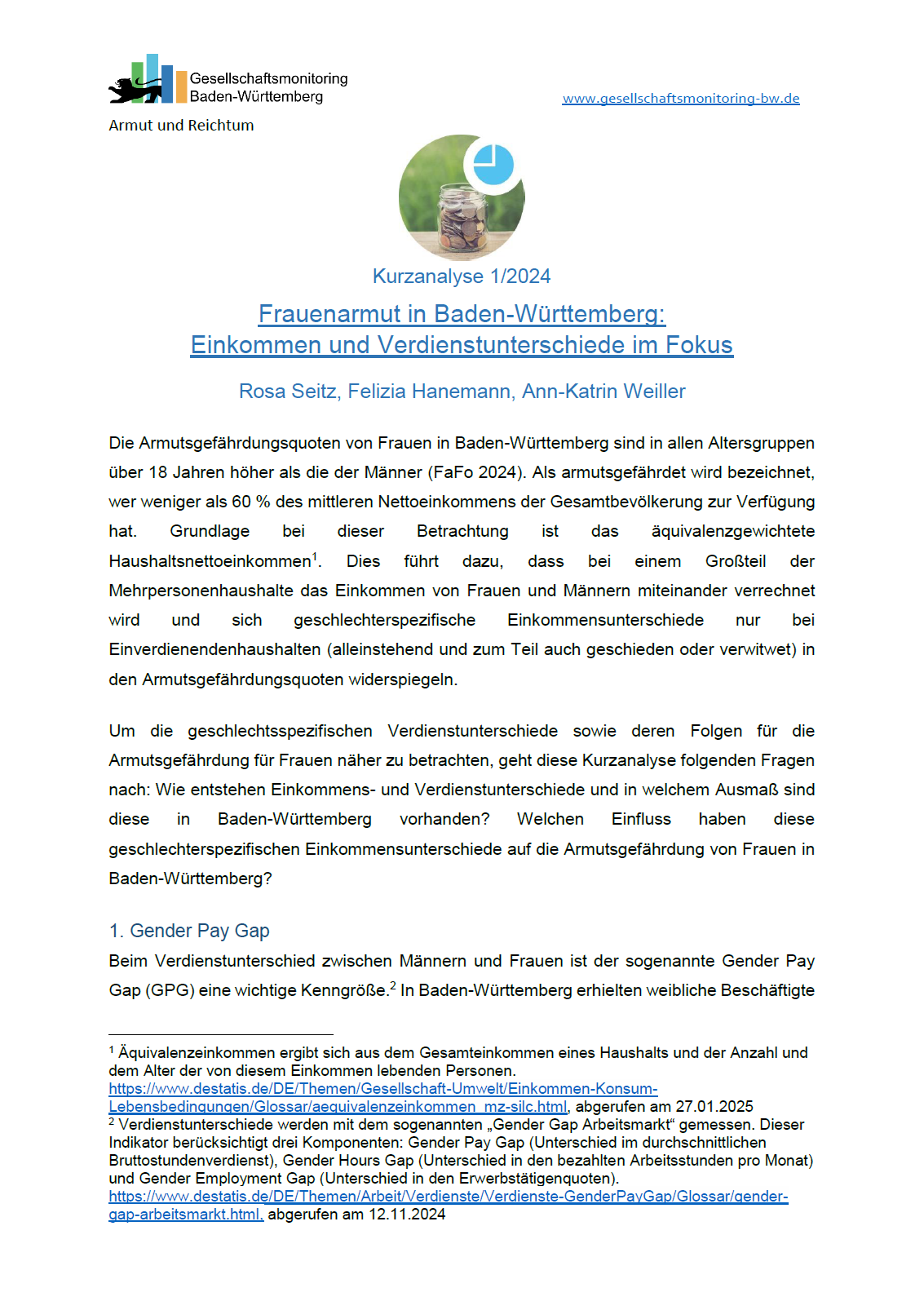Armutsberichterstattung: Kurzanalyse zum Thema „Frauenarmut in Baden-Württemberg: Einkommen und Verdienstunterschiede im Fokus“ veröffentlicht