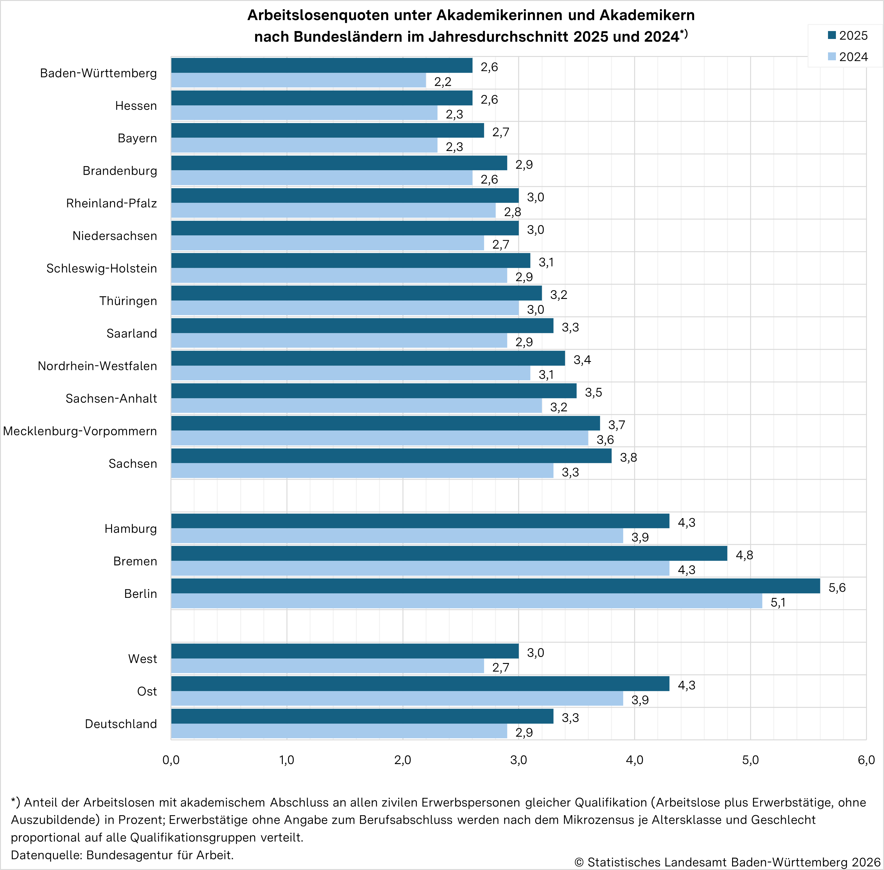 Im Jahresdurchschnitt 2025 waren bundesweit insgesamt 6,3 % der Erwerbspersonen arbeitslos. Auch die spezifischen Arbeitslosenquoten der Akademikerinnen und Akademiker mit 3,3 % und jene der Personen mit betrieblicher/schulischer Ausbildung mit 3,6 % lagen auf Bundesebene spürbar höher als im Südwesten. In der Gruppe der Personen ohne abgeschlossene Berufsausbildung lag die Arbeitslosenquote in Deutschland mit 21,3 % fast anderthalb Mal so hoch wie in Baden‑Württemberg. Im Bundesländervergleich war die Arbeitslosenquote von Akademikerinnen und Akademikern in Baden-Württemberg, zusammen mit Hessen mit jeweils mit 2,6 % am niedrigsten. Dahinter reihten sich Bayern (2,7 %), Brandenburg (2,9 %) sowie Niedersachsen und Rheinland-Pfalz mit jeweils 3,0 % ein. Die scheinbar schlechtesten Chancen für arbeitslose Hochqualifizierte gab es am Arbeitsmarkt in den Stadtstaaten Berlin (5,6 %), Bremen (4,8 %) und Hamburg (4,3 %). Allerdings müssen diese recht hohen Quoten nicht zwingend auf ungünstigere Beschäftigungsmöglichkeiten schließen lassen, sondern können unter anderem auch auf den hohen Anteil zuziehender Akademikerinnen und Akademiker sowie auf Besonderheiten der regionalen Arbeitsmärkte zurückzuführen sein.