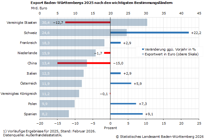 Die exportseitig größten Zugewinne hingegen gab es 2025 im Handel mit der Schweiz. Nach einer Zuwachsrate von 9,9 % im Jahr 2024 zogen die baden-württembergischen Exportbeziehungen mit dem Nachbarstaat weiter an. So erhöhten sich die Ausfuhren 2025 auf 24,6 Milliarden Euro (+22,2 % bzw. +4,5 Milliarden Euro). Damit untermauerte die Schweiz Rang 2 der wichtigsten Zielländer des Südwestens. Die Ränge 3 und 4 belegten Frankreich (+2,9 %) und die Niederlande (−1,7 %). Wie sich bereits im Jahresverlauf angedeutet hatte, registrierten Baden-Württembergs Unternehmen im Export nach China massive Verluste (Rang 5 unter den Zielländern). Die Warenbewegungen in die Volksrepublik betrugen 2025 rund 13,4 Milliarden Euro und lagen im Warenwert um 15,0 % bzw. 2,4 Milliarden Euro niedriger als ein Jahr zuvor.
