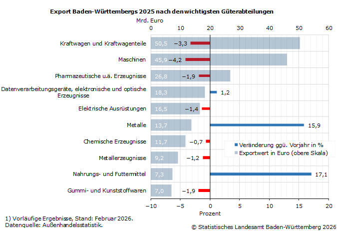 Die drei Schlüsselbranchen der Südwest-Exportwirtschaft 2025 verzeichneten allesamt geringere Ausfuhrwerte als im Vorjahr. Kraftwagen und Kraftwagenteile waren mit einem Wert von 50,5 Milliarden Euro auch im Gesamtjahr 2025 die im Ausland gefragtesten Waren aus baden-württembergischer Produktion (−3,3 % zum Vorjahreszeitraum). Dahinter folgten Maschinen mit 45,9 Milliarden Euro (−4,2 %). Für beide Güterabteilungen war es das zweite Jahr mit rückläufigen Ausfuhren. Auf Rang 3 landeten Pharmazeutische u. ä. Erzeugnisse mit 26,8 Milliarden Euro, bei einem Minus von 1,9 % zum Vorjahr. Positive Zuwachsraten gab es beispielsweise bei Energie bzw. elektrischem Strom (Rang 15; +46,1 %), Abfällen/Wertstoffen aus der Rückgewinnung (Rang 12; +33,4 %), Nahrungs- und Futtermitteln (Rang 9; +17,1 %) oder Metallen (Rang 6; +16,4 %).