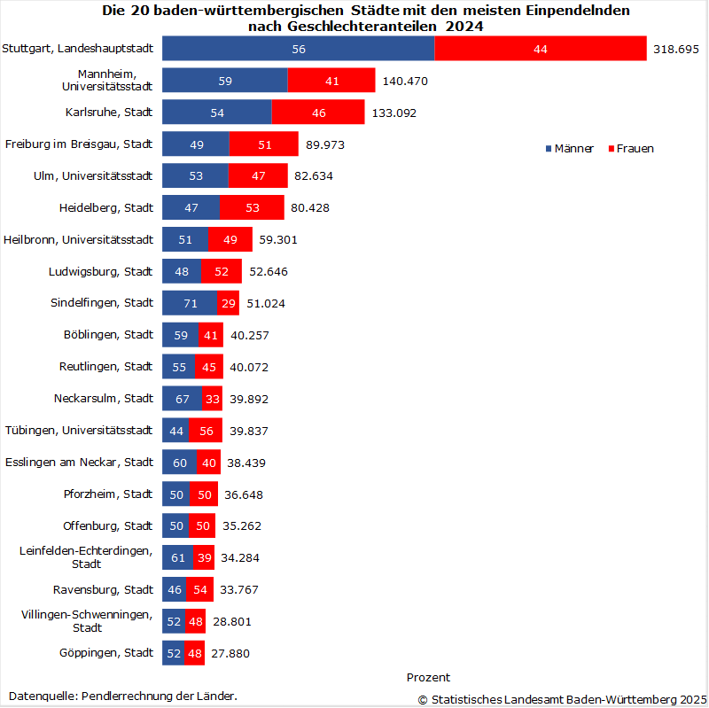 Wie aus den Ergebnissen der Pendlerrechnung der Länder weiter hervorgeht, stellten die Stadtkreise Stuttgart (318.700 Einpendelnde), Mannheim (140.500) und Karlsruhe (133.100) im Jahr 2024 die stärksten Pendelmagneten im Südwesten dar. Der Geschlechteranteil unter den Einpendelnden korreliert dabei auch mit der Wirtschaftsstruktur der entsprechenden Arbeitsortgemeinde. Gemeinden mit hohen Anteilen an typisch weiblich dominierten Wirtschaftszweigen wie dem Gesundheitswesen oder der öffentlichen Verwaltung wiesen auch oft überdurchschnittliche Frauenquoten auf. Im Gegenzug zogen industriell geprägte Arbeitsorte häufiger männliche Personen an.