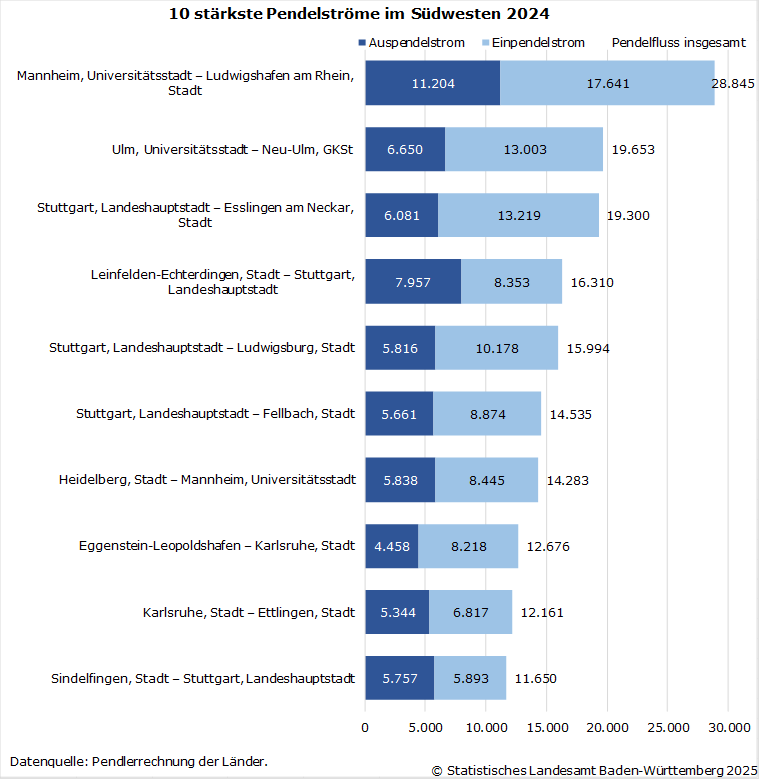 Neben Ein- und Auspendelnden sowie innerörtlich Pendelnden wurden auch erwerbsbedingte potenzielle Mobilitätsströme bzw. Pendelverflechtungen berechnet. Wie viele Personen ein Pendelstrom umfasst, ist maßgeblich von der Größe und Attraktivität des Arbeitsortes abhängig. Aber auch die Größe des Wohnortes und seine Entfernung vom Arbeitsort spielen eine Rolle. Die stärkste Pendelverflechtung zweier Gemeinden mit Südwest-Beteiligung gab es 2024 zwischen Mannheim und dem rheinland-pfälzischen Ludwigshafen. Der Pendelfluss umfasste insgesamt über beide Richtungen rund 28.800 Personen, davon pendelten gut 17.600 von Ludwigshafen nach Mannheim und 11.200 von Mannheim nach Ludwigshafen. Auch die zweitstärkste Pendelverflechtung verlief über eine Landesgrenze und zwar zwischen dem bayerischen Neu-Ulm und dem baden-württembergischen Ulm. Stark frequentiert waren auch die Ein- sowie Auspendelverflechtungen zwischen der Landeshauptstadt Stuttgart und den umliegenden Gemeinden Esslingen, Leinfelden-Echterdingen, Ludwigsburg und Fellbach.