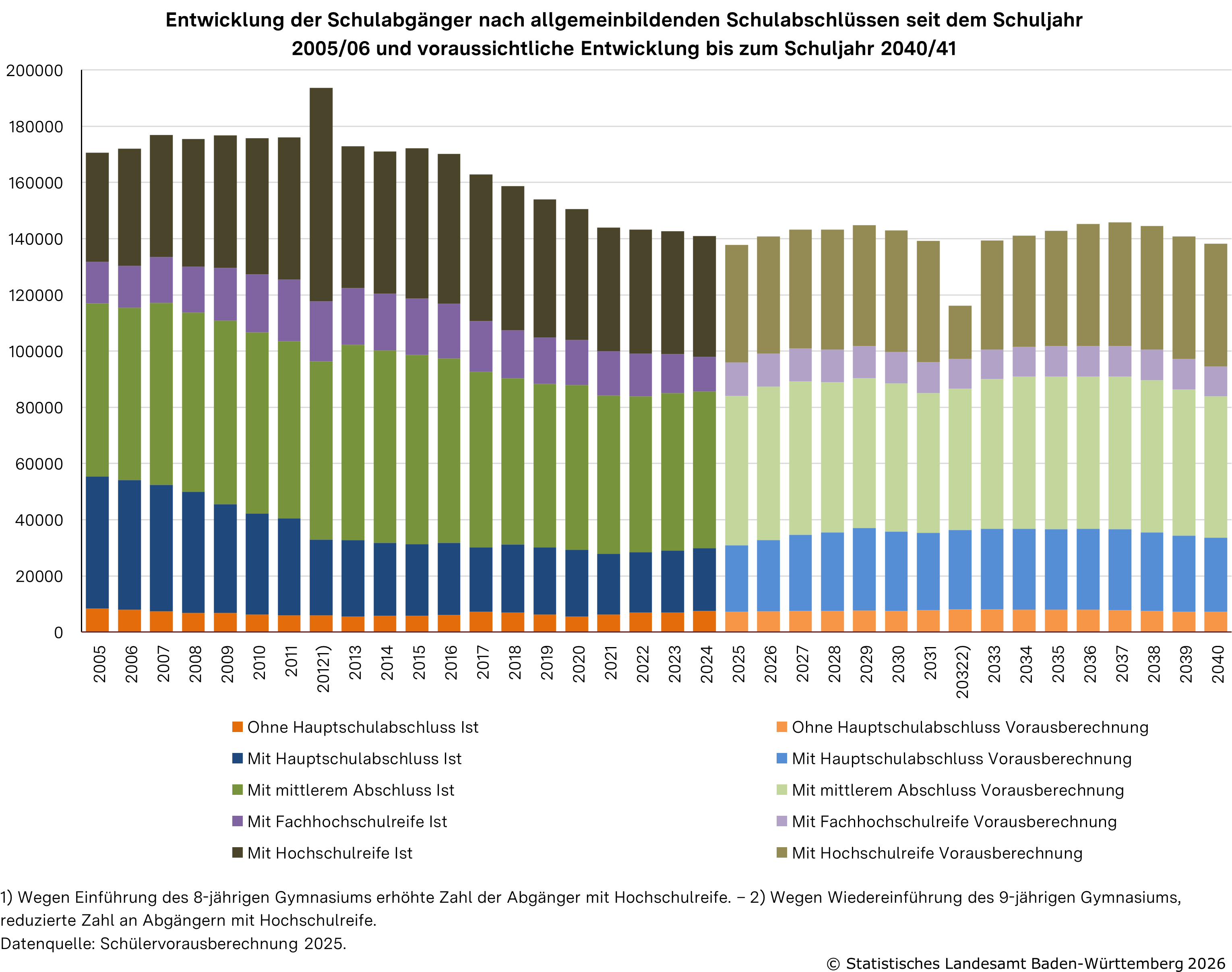 In den letzten Jahren wurde demographisch bedingt ein deutlicher Rückgang der Schulabgängerzahlen ermittelt. Für die nächsten 15 Jahre wird erwartet, dass sich der Rückgang nicht fortsetzen wird. Die Zahl derer, die mit frisch erworbenem allgemeinbildendem Schulabschluss von allgemeinbildenden und beruflichen Schulen abgehen, wird sich bei jährlich gut 140.000 stabilisieren. Das sind jährlich gut 30.000 weniger als im Zeitraum 2005 bis 2015, stellt das Statistische Landesamt Baden-Württemberg fest.