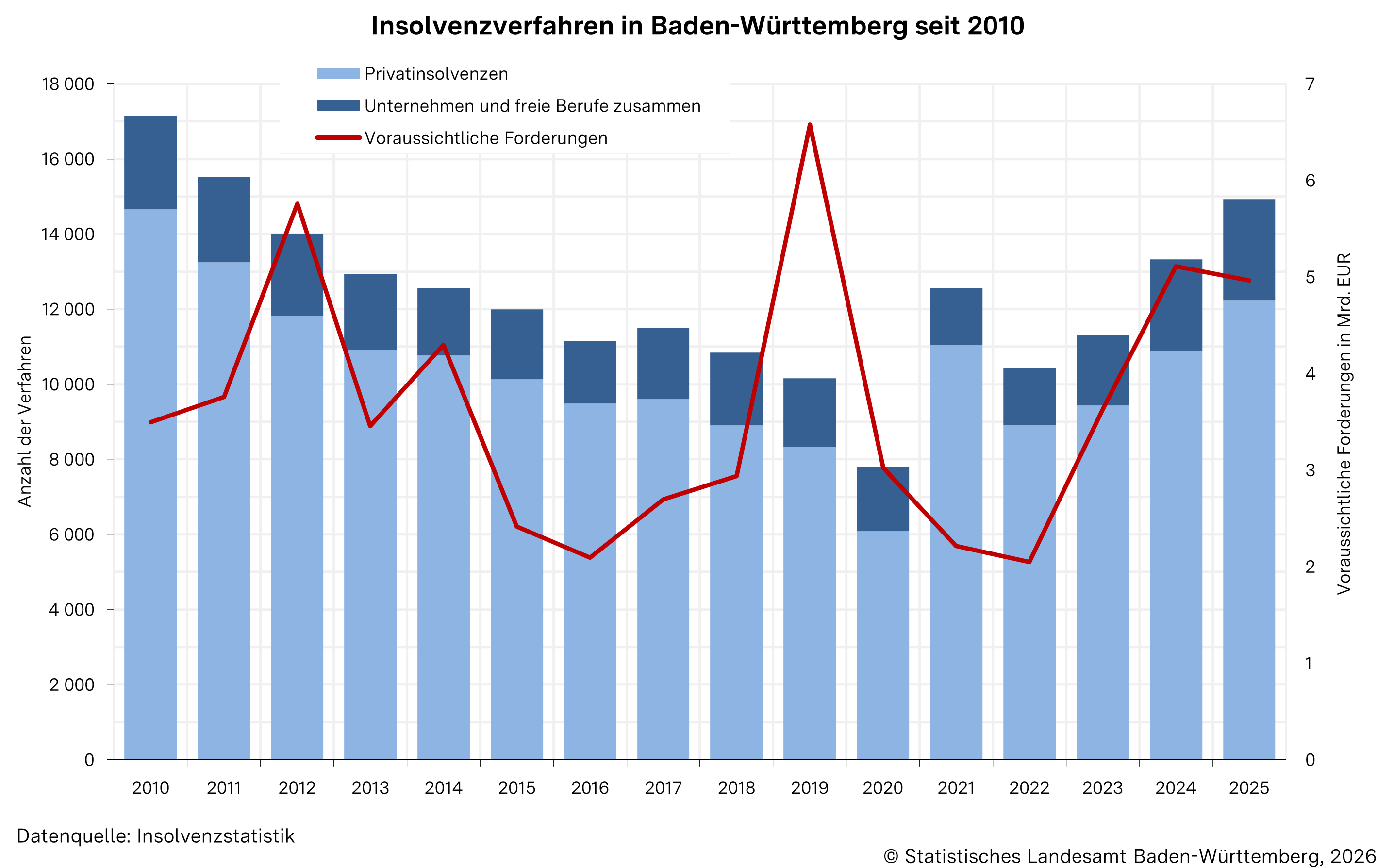 Im Jahr 2025 wurden somit im Gesamtergebnis bei den Amtsgerichten in Baden-Württemberg 14.928 Insolvenzverfahren, also Unternehmens- und Privatinsolvenzen, beantragt. Das waren 1.597 Verfahren oder 12 % mehr als im entsprechenden Vergleichszeitraum des Vorjahres. Die voraussichtlichen Forderungen der Gläubiger summierten sich auf fast 5 Milliarden Euro. Insgesamt 22.433 Arbeitnehmerinnen und Arbeitnehmer waren 2025 von Unternehmensinsolvenzen betroffen.
