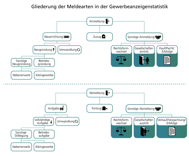 Unternehmensgründungen stellen einen bedeutenden Impuls für Volkswirtschaften dar. Es besteht eine Anzeigepflicht gegenüber dem Gewerbeamt beim Beginn, bei Änderungen oder Beendigung einer gewerblichen Tätigkeit. Die Gewerbeanzeigenstatistik liefert monatliche Informationen über Existenzgründungen und Stilllegungen nach Wirtschaftsbereichen, Rechtsformen, der Anzahl der Beschäftigten sowie regionaler Zuordnung.